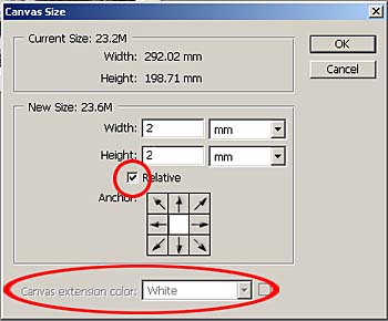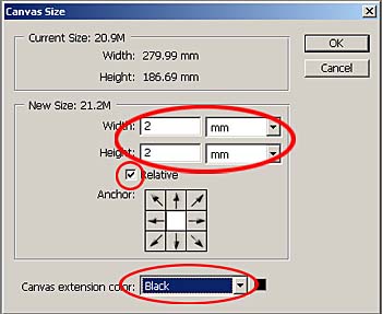 Step 1: Create the first border around the image by going to Image>Canvas Size. In the canvas size palette make sure the relative box is ticked, then input the values of 2mm width and 2mm height, set the colour to black. Click OK. This will give us a 1mm black border all around the image, in black.
