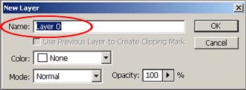 The new layer palette will appear. Accept the “layer 0” name by clicking OK. This has renamed the background layer into “layer 0”. It is now an independent layer and can be moved anywhere in the layer stack, (all will come clear later).