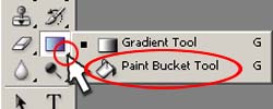 Step 8: Next click on the paint bucket tool located in the middle of the tool palette. If you are unable to see the paint bucket tool, it will be hidden under the gradient tool. To select the hidden paint bucket, click and hold down your left hand mouse button on the small black triangle in the bottom right hand corner of the gradient tool. This will show the flyout menu. Click on the paint bucket tool to select it.