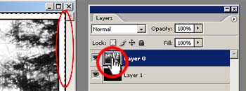 Step 6: With “layer 1” active (shown in blue), move your cursor over the blue area of “layer 1” in the layers palette. The cursor will change into a “hand”. Click and hold down the left mouse button and drag “layer 1” down, under “layer 0”. This has changed the layer order, “layer 0” is now on top of “layer 1”. If we had not renamed the “background” layer earlier in this workshop we would not have been able to do this. The background layer would have been stuck at the base of the layer stack.
