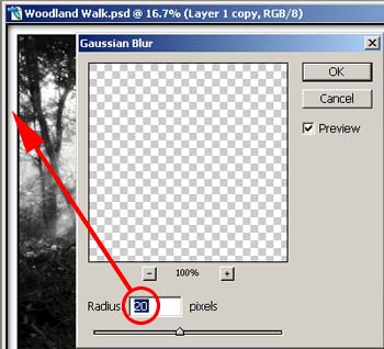 Step 15: Click on “layer 1 copy” to select it. Go to Filter>Blur>Gaussian Blur. While adjusting the blur amount watch the outside of your image to get your desired blur effect. I used a value of 20. This gave me enough drop shadow without it bleeding into the white area around the image. Click OK to apply