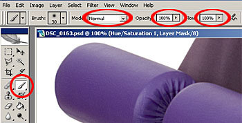 Step 7: Select the paint brush tool, (keyboard short cut, B). Make sure the paint brush options are set to, mode normal, opacity 100% and flow 100%.
