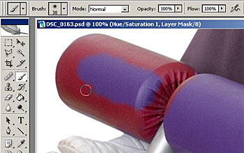 Step 9: With the “Hue/Saturation 1” layer active (shown in blue) start to paint (using foreground set to white) over the parts of the image where you want to retrieve the colour adjustments we made earlier. Move around the image painting over all the areas where you need to retrieve the colour. Use the square bracket keys to increase and decrease the size of the brush as you go.