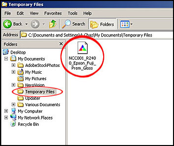 Step 2: If you have received your print profile by email, firstly you need to save the ICC Profile attachment to a convenient location on your computer, where you will be able to locate it later in this workshop. If you have collected your print profile on a key/pen drive you will also need to transfer the ICC profile from your key/pen drive to a convenient location on your computer, where you will be able to locate it later in this workshop. For the purpose of this workshop my ICC profile name is “NCC001_R2400_Epson_Fuji_Prem_Gloss” (your profile name will differ slightly, but will start with the “NCC” prefix) which I have saved to a “Temporary Files” folder within “My Documents”.