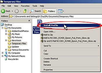Step 3: Open up “Windows Explorer”. A quick way of doing this is to click the right hand mouse button on the “Start” button in the bottom left hand corner of your computer screen. In the flyout menu box, left click on “Explore”. Now you are in the “Windows Explorer” section of your computer. You now need to locate the ICC profile you have just saved from email or transfer from a key/pen drive. My profile is located in a “Temporary Files” folder within “My Documents”.