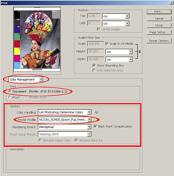 When you are ready to use your ICC profile to print an image, you need to go to File>Print with Preview. In “Print with Preview” dialog box you will see your image in the top left hand corner. If you wish to use the “Scale to Fit Media” option you are now free to do so. In the “How to get a print profile” workshop we un-ticked this box to print the target profile. Under your image preview, click the arrow on the right hand side to select “Colour Management”. In the “Print” box select “Document (Profile sRGB IEC6199-2.1)”. In the “Options” box select “Let Photoshop Determine Colours” from the Colour Handling Menu. In the “Printer Profile” box, click the arrow on the right hand side and select the printer profile you have just installed. The “Rendering Intent” should be set to “Perceptual” and the “Black Point Compensation” should be ticked. Then click Print.