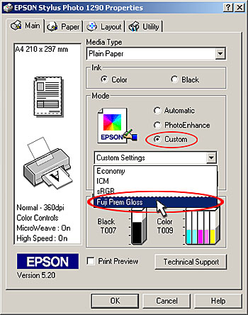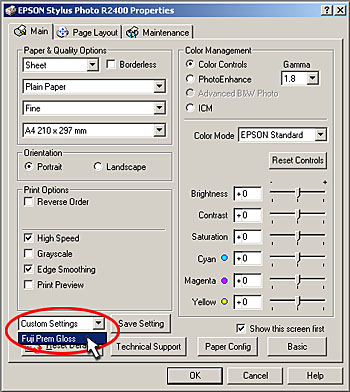 When printing with Epson 1400 Series, R1800, R1900 and R2400, you firstly need to navigate your way onto the advanced page of your printer properties dialog box as you did to create the settings for the target print profile. Once on this page, Click the arrow next to the “Custom Settings” box, located in the bottom left hand corner of the print properties box. In the “Custom Settings” drop down menu select “Fuji Prem Gloss”, (you will need to select the custom name you created in the “How to get a print profile workshop”) this will load all the settings we created to print the target file on the Fuji Premium Gloss paper, (see note above for A3 papers), Click Ok. (Follow onto “Finally, All Printers”, below).