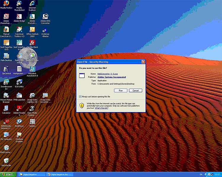 2.6 Depending upon how you have set up your browser the file will be saved to a folder or to the desk top. (The desk top option is shown below). Double left clicking the download will open the usual installer and selecting “Run” will add DNG Converter to your Program List.