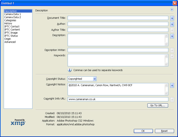 3.6. Enter your copyright information in the Copyright Notice section. If you have a web site enter it in the Copyright Info URL window. The copyright symbol is Alt+0169 (Windows). See Figure 2 below.