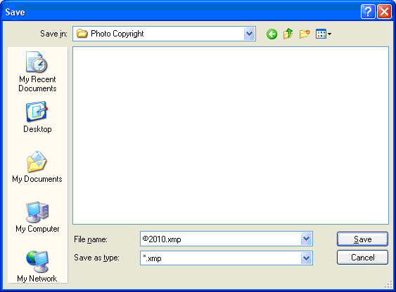 3.9. Name your file ©2010.xmp (then make a new one next year and name it ©2011.xmp). Save it to a folder in My Pictures. For instance the folder is called “Photo Copyright” in Figure 4 below.