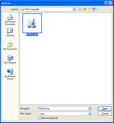 4.20. Navigate to where you saved the copyright ©2010.xmp file, select it then click Open as shown in Figure 14.