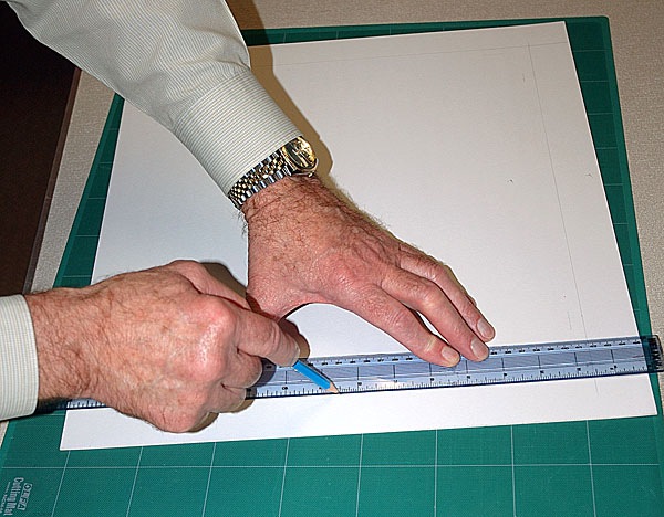 Measure out 3/8 ths of an inch from each of the corner lines and mark with a pencil dot. Now join these dots with a continuous pencil line the full width and length of the card. See figs 07 and 08. These will be the guide lines for the bevel cutting.