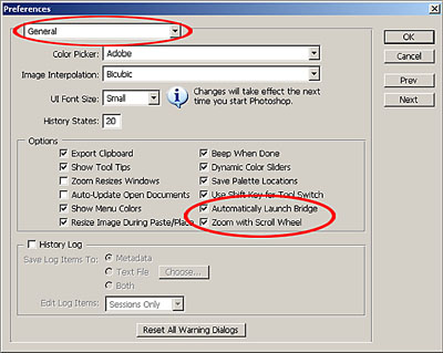 The only other changes we are going to make are in the Options section. We need to tick “Automatically Launch Bridge” this will load the Bridge browser everytime we open Photoshop. The Bridge browser makes it very easy to locate and open our images into Photoshop. The other option we need to tick is “Zoom with Scroll Wheel” this allows the scroll wheel of your mouse to become a permanent zoom tool, this is a very useful short cut when working with your images. All other options should be left as the defaults and match the image below.