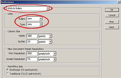 In the Units and Rulers dialog box the only options we need to change are under the Units option. Select “mm” from the drop down menus for both the Rulers and Type options. All other options should be left as the default settings (see image below).
