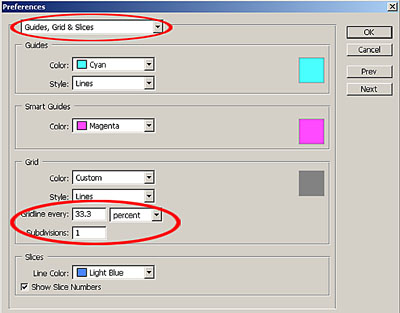 The only option we are going to change here are the Grid settings. In the “Gridline every” box, type 33.3 and change the measurement to percent from the drop down menu. In the “Subdivisions” field, change the default value setting of 4 to 1. When we now use the “View>Show> Grid” option in Photoshop our image will be divided into perfect thirds! To read more about using Grids, see page 91 of “The Photoshop CS2 book” by Scott Kelby. All the other options can be left as the defaults (see image below).