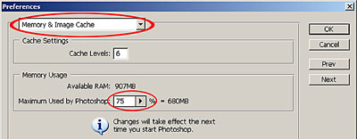 The option we need to change here is the “Memory Usage”. (Your available RAM may differ from the image below). We need to change this option to give Photoshop as much Random Access Memory (RAM) as possible. The RAM is the memory that Photoshop uses to process the operations we ask it to perform. The more RAM we can give to Photoshop the faster and smoother it will run. To allocate more RAM to Photoshop change the “Maximum Used by Photoshop” option to a value of 75%. If you input a higher value you could experience problems if you try to open more programs while running Photoshop.