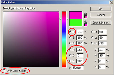 In the Colour Picker dialog box, first ensure the “Only Web Colours” is un-ticked. Next ensure the “H” radio button is on (black dot in it). At this point you can choose your own colour by using the colour picker or you can type these values into the RGB fields to give you an adequate vivid colour, R 255, G 0, B 200. These values have given us a bright pink, (85% Magenta). Click OK.