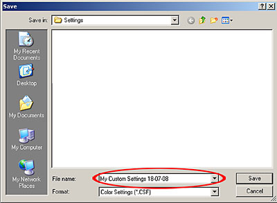 When you have matched all the settings in the dialog box, click “Save”. In the Save dialog box (see next page) we need to give our new custom settings a file name, I used “My Custom Settings 18-07-08”. I included the date in my file name so I know when the settings were created. Click Save.
