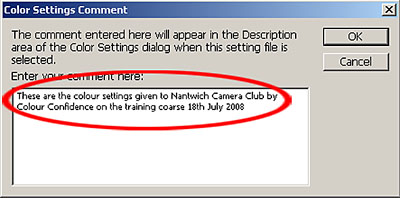 The next dialog box to appear is the “Colour Settings Comments”. Here you can make comments about your custom colour settings. I made a quick comment on where these settings had come from. Make your own comment or leave it blank. Click OK