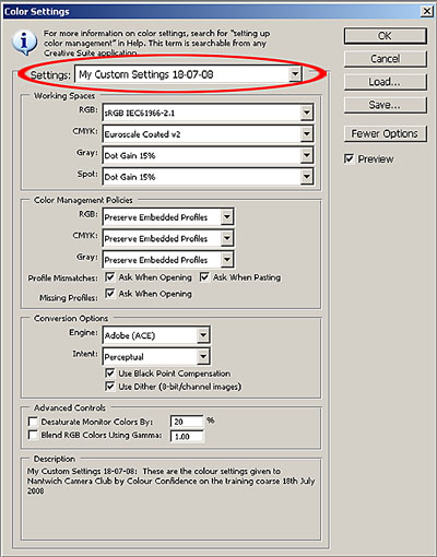 Your Colour Settings dialog box should now look like this (see below). Settings will show your new custom settings name, and any comments you made will appear at the bottom. Click OK to save and apply these new custom settings.